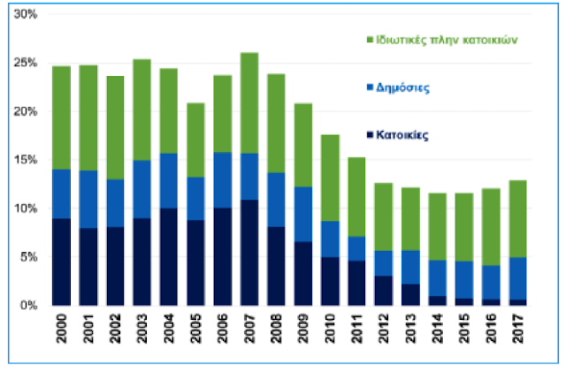 Οι ιδιωτικές επιχειρηματικές επενδύσεις είναι σήμερα χαμηλότερες από το επίπεδο πριν το ξέσπασμα της κρίσης. Οι επενδύσεις σε κατοικίες έχουν κυριολεκτικά καταρρεύσει και είναι υπεύθυνες για το μεγαλύτερο μέρος της μείωσης του ΑΣΠΚ. Προσοχή, ο ΑΣΠΚ στις κατοικίες προσέφερε ετησίως πάνω από 20 δις ευρώ στις συνολικές επενδύσεις.