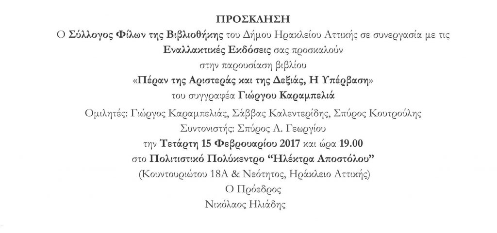 Ο Σύλλογος Φίλων της Βιβλιοθήκης του Δήμου Ηρακλείου Αττικής σε συνεργασία με το Τμήμα Βιβλιοθήκης του Δήμου Ηρακλείου Αττικής και τις Εναλλακτικές Εκδόσεις σας προσκαλούν
