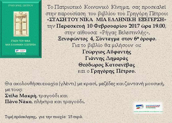 Το Πατριωτικό Κοινωνικό Κίνημα σας προσκαλεί στην παρουσίαση βιβλίου του Γρηγόρη Πέτρου: “Στάση του Νίκα, μια ελληνική εξέγερση” την Παρασκευή 10 Φεβρουαρίου 2017 ώρα 19.00,