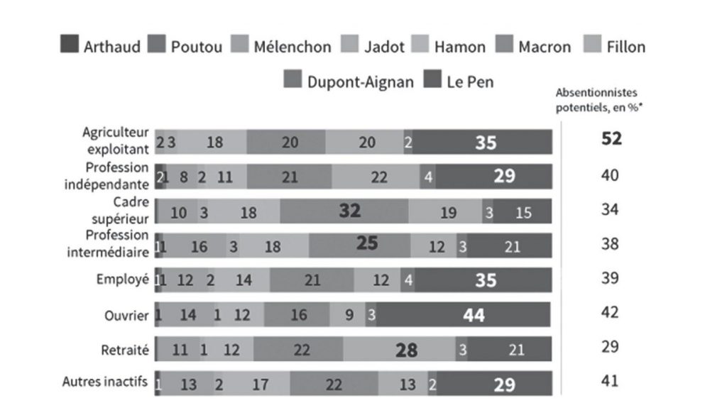 Τον Φεβρουάριο του 2017, παίρνοντας υπόψη το σύνολο των εγγεγραμμένων στους εκλογικούς καταλόγους εργατών, το 42% από αυτούς σκοπεύουν να μην ψηφίσουν, έναντι του 39% των υπαλλήλων και του 34% των στελεχών και των ελευθέρων επαγγελματιών. Έτσι, μεταξύ των 100 εργατών, το 42% πιθανότατα θα απέχει, 25% θα ψηφίσει Λεπέν, 10% θα επιλέξει τον Εμμανουέλ Μακρόν, το 8% τον Ζαν Λυκ Μελανσόν και το 7% τον Μπενουά Αμόν. Κατά συνέπεια, το πρώτο κόμμα των εργατών είναι η αποχή, πολύ περισσότερο από το Εθνικό Μέτωπο. Αλλά, μεταξύ των εργατών που είναι βέβαιοι ότι θα ψηφίσουν (58%), το 44% θα υποστηρίξει το Εθνικό Μέτωπο· το 16% στηρίζει τον υποψήφιο του «Εμπρός» (τον Μακρόν, 14% τον ηγέτη της «Ανυπότακτης Γαλλίας» (τον Μελανσόν, και 12% τον πρόσφατο νικητή των σοσιαλιστικών προκριματικών (τον Αμόν).