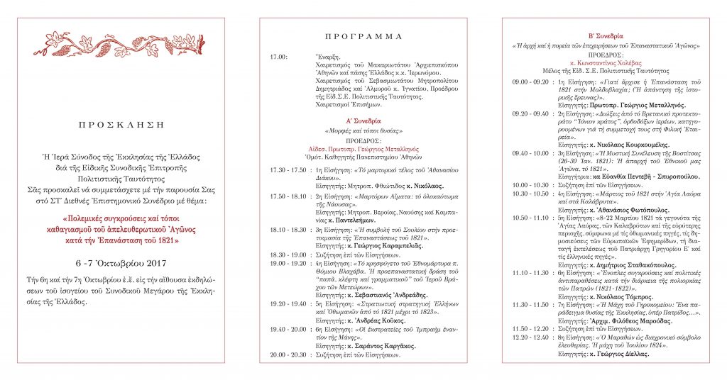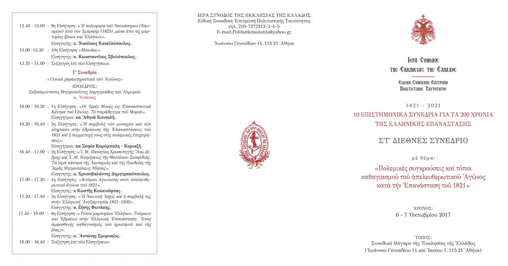 Η Ιερά Σύνοδος της Εκκλησίας της Ελλάδος ανακοινώνει οτι πραγματοποιείται στις 6 και 7 Οκτωβρίου 2017 το ΣΤ΄ Διεθνές Επιστημονικό Συνέδριο, το οποίο εντάσσεται στη σειρά των δέκα (10) Επιστημονικών Συνεδρίων για τα 200 χρόνια της Ελληνικής Επαναστάσεως (1821-2021).