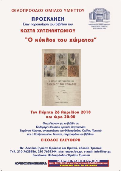 Η ομάδα Βιβλίου του Φ.Ο.Υ. διοργανώνει, τηνΠέμπτη 26/4/18 στις 20:00, εκδήλωση-παρουσίαση του βιβλίου του Κώστα Χατζηαντωνίου: