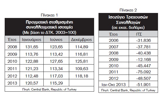 Όπως έχω δείξει, ο συγκεκριμένος τρόπος μεγέθυνσης της τουρκικής οικονομίας είχε ως αρνητικά παρεπόμενα τη μεγέθυνση του ελλείμματος του ισοζυγίου τρεχουσών συναλλαγών και του εμπορικού ισοζυγίου, την αύξηση του πληθωρισμού, τη μεγάλη διολίσθηση του εγχωρίου νομίσματος έναντι του δολαρίου και των υπολοίπων ισχυρών νομισμάτων. Για την ακρίβεια, η τουρκική λίρα είχε συγκριτικά τη χειρότερη επίδοση μεταξύ των νομισμάτων των αναπτυσσομένων οικονομιών. Στις 17.01.2014 η ισοτιμία της σε σχέση με το δολάριο άγγιξε το υψηλότερο σημείο περίπου 2,22.