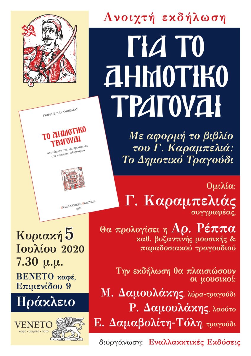 Οι Εναλλακτικές Εκδόσεις με αφορμή το βιβλίο του Γ. Καραμπελιά, Το Δημοτικό Τραγούδι, θα πραγματοποιήσουν την Κυριακή 5 Ιουλίου στις 19.30 ανοιχτή εκδήλωση με θέμα:
