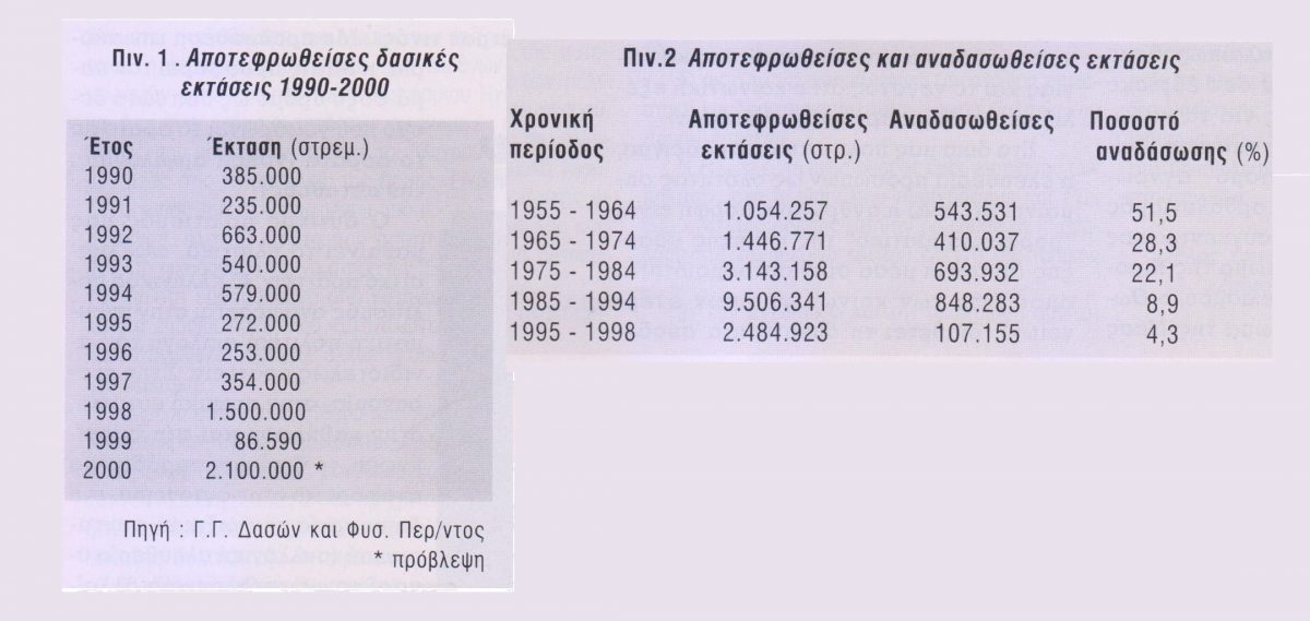 Είναι γνωστό ότι το δάσος μπορεί να ευδοκιμήσει στο σύνολο σχεδόν της ελληνικής γης, όμως σήμερα το ποσοστό δασοκάλυψης κυμαίνεται περίπου στο 16-17%. Η αυξητική τάση των δασικών καταστροφών τις τελευταίες δεκαετίες έχει καταγραφεί σαφώς. Η έκταση των εθνικών δρυμών, των αισθητικών δασών και των μνημείων της φύσης φτάνει μόλις το 0,9% της επικράτειας, όταν το ποσοστό αυτό σε άλλες χώρες είναι διψήφιο. Το “εθνικό έγκλημα” είναι συνεχές και οι αιτίες μοιάζουν σαν ένα πολύχρωμο ψηφιδωτό με πολλές ψηφίδες : ανεπάρκεια και αναποτελεσματικότητα της διοίκησης σε όλες τις βαθμίδες της, πλαστογραφίες και ψεύτικες αγοραπωλησίες, έλλειψη δασικού κτηματολογίου, οικοπεδοποίηση δα-σοτεμαχίων, παράβαση καθήκοντος κρατικών λειτουργών, νομοθετικά κενά, έλλειψη πολιτικής δασικής αρχής, αστικοποίηση, συντεχνίες οικοπεδοφάγων, ανεπαρκής εθελοντισμός, μη ικανοποιητικό ποσοστό τεχνητής αναδάσωσης, μικροπολιτικά συμφέροντα, αποχαρακτηρισμοί δασικών εκτάσεων, ελλειμματική κοινωνική συνείδηση και μειωμένο αίσθημα υπευθυνότητας των πολιτών, πάθος για κοινωνική ανέλιξη, φαινόμενο του θερμοκηπίου, τεχνοποίηση του φυσικού περιβάλλοντος,….