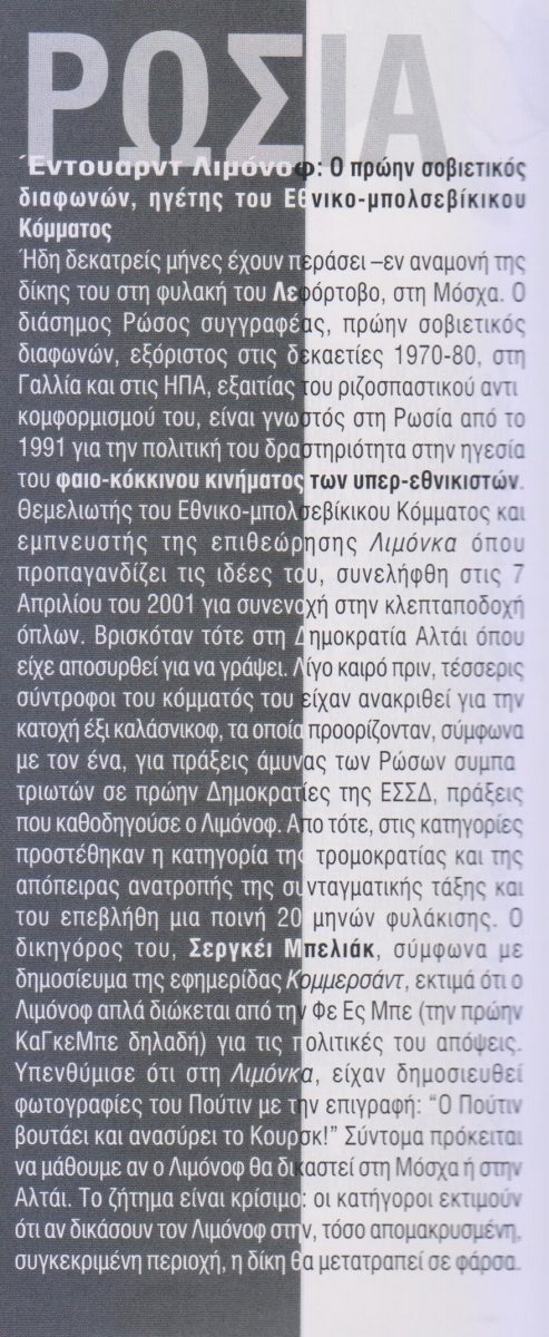 Διεθνή Ε. Λιμόνοφ: Ηγέτης του φαιο-κόκκινου κινήματος της Ρωσίας από Άρδην - Ρήξη 19 Ιουνίου 2002 από Άρδην - Ρήξη 19 Ιουνίου 2002 987 από το Άρδην, τ. 36, Μάιος-Ιούνιος 2002 ΔΙΑΒΑΣΤΕ ΕΠΙΣΗΣ Σφυροκοπούν το Κομπανί με την ανοχή της Άγκυρας 29 Νοεμβρίου 2014 Η Ρωσία «αναμορφώνει» παιδιά από την κατεχόμενη Ουκρανία 19 Σεπτεμβρίου 2025 Game over για Ερντογάν: Ούτε δολάριο στα αποθέματά του – παρακαλά τη Fed για βοήθεια 1 Απριλίου 2020 Νέες ταραχές στην Αλβανία 30 Νοεμβρίου 1998 Ελλάδα, Ισραήλ και Τουρκία: Επικίνδυνοι χοροί 18 Σεπτεμβρίου 2012 Η 5η Μαΐου του Μπόμπι Σαντς και το φοβερό μήνυμά του 5 Μαΐου 2021 Κοινοποιήσεις:Tweet Εκτύπωση(Ανοίγει σε νέο παράθυρο) Εκτύπωση Email a link to a friend(Ανοίγει σε νέο παράθυρο) Email Άρδην τ. 36 FacebookTwitterWhatsappViberEmail ΣΧΕΤΙΚΑ Ο πόλεμος στο Ιράν αποκάλυψε την αποδυναμωμένη κατάσταση... 17 Απριλίου 2026 Αγγ. Συρίγος: Οι απειλές Ερντογάν κατά της Τριμερούς... 16 Απριλίου 2026 «Το ιρανικό καθεστώς βγαίνει ενισχυμένο από τη μη... 16 Απριλίου 2026 Τι σημαίνει για Τραμπ, Πούτιν, Ουκρανία και Βρυξέλλες... 15 Απριλίου 2026 Η παρακμή της υπερδύναμης φέρνει πολέμους 15 Απριλίου 2026 Πώς οι Τραμπ έχασαν $1 δισ. στο Bitcoin... 14 Απριλίου 2026 Ο εσωτερικός απολογισμος του Ιράν – τουλάχιστον 7.650... 13 Απριλίου 2026 Η οικονομική καταστροφή που προκάλεσε ο πόλεμος στο... 12 Απριλίου 2026 Ρωσία: Σφαγείο νούμερο δύο 8 Απριλίου 2026 Τραμπ: ο μοιραίος Πρόεδρος 7 Απριλίου 2026 Άρδην - Ρήξη ΑΦΗΣΤΕ ΕΝΑ ΣΧΟΛΙΟ Cancel Reply Αποδέχομαι την αποθήκευση του ονόματός μου και του email μου με σκοπό την εκ νέου χρήση τους την επόμενη φορά που θα σχολιάσω. Δ