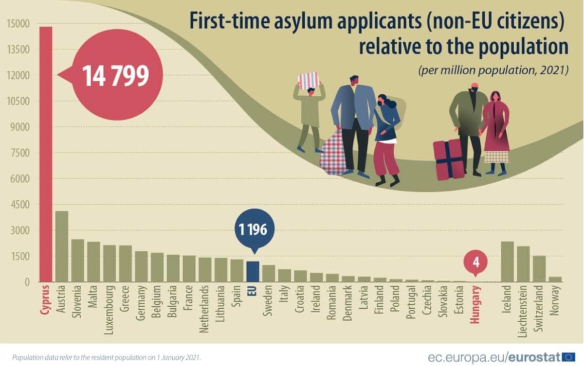 Ο πιο κάτω πίνακας είναι επίσημα στοιχεία για τους πόσους αιτητές πολιτικού ασύλου δέχθηκε κάθε χώρα της ΕΕ το 2021 ανά ένα εκατομμύριο πληθυσμό. Η Κύπρος είναι πρώτη με τεράστια διαφορά. Πρέπει να τύχει αποτελεσματικής διαχείρισης αυτό το θέμα αλλιώς τα προβλήματα που πηγάζουν από αυτές τις ροές θα γίνουν μη διαχειρίσιμα.