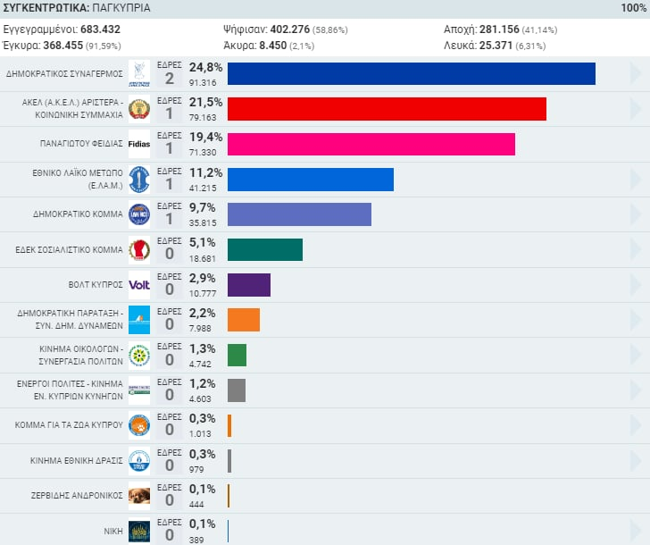 Μεγάλοι χαμένοι είναι τα κοινοβουλευτικά κόμματα του ενδιάμεσου χώρου τα οποία αποτελούν τον άτυπο κυβερνητικό συνασπισμό που στηρίζει τον Πρόεδρο Νίκο Χριστοδουλίδη. ΔΗΚΟ, ΕΔΕΚ και ΔΗΠΑ, δεν ξεπέρασαν συνολικά το 17%.