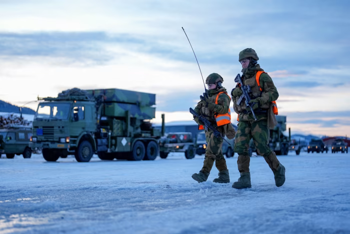 Νορβηγοί στρατιώτες μπροστά από οχήματα καθώς στρατιωτικός εξοπλισμός ετοιμάζεται να φορτωθεί σε πλοίο στο λιμάνι του Όρκανγκερ της Νορβηγίας.