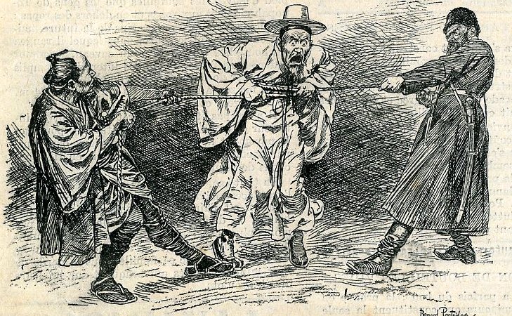 Η Ιαπωνία από τη μία και η Ρωσία απ’ την άλλη σφίγγουν με σχοινιά μια ανήμπορη Κορέα. Σκίτσο από το βρετανικό περιοδικό Punch
