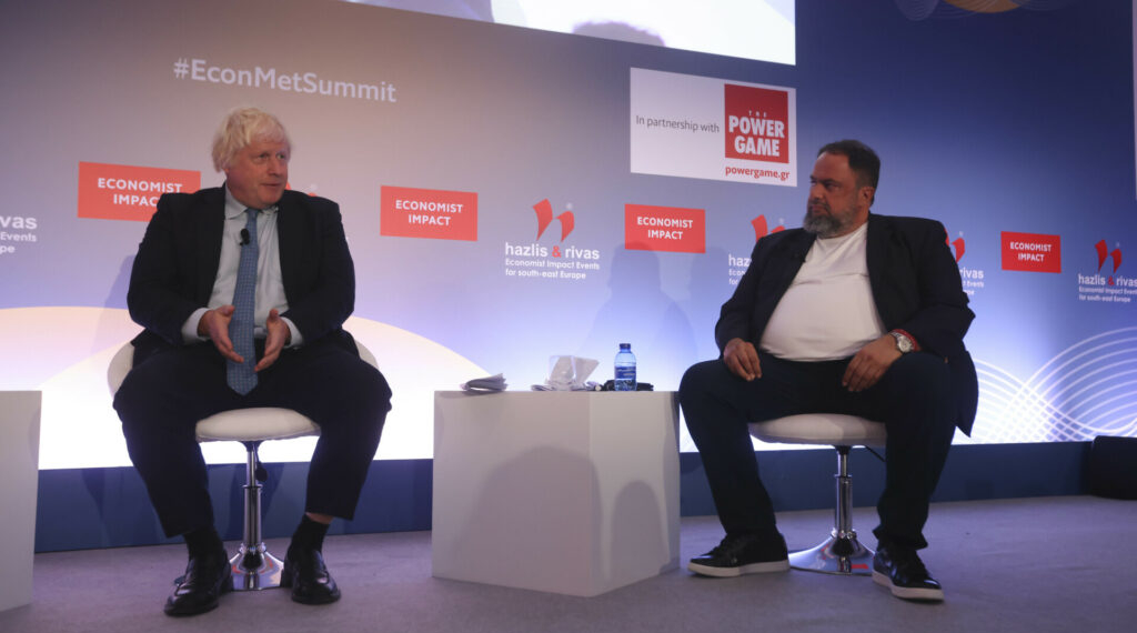 Το ζουμί όμως της παρουσίας του Β. Μαρινάκη ήταν η έντονη στιχομυθία που είχε με τον Μπόρις Τζόνσον για την ρωσική εισβολή στην Ουκρανία. Ο Μαρινάκης επαναλάμβανε τα γνωστά επιχειρήματα των απολογητών της ρωσικής πλευράς ότι ο πόλεμος θα σταματήσει όταν κοπεί η χρηματοδότηση στον Ζελένσκι. Ο Τζόνσον του απάντησε ότι οι Ουκρανοί μπορούν να συνεχίσουν τον πόλεμο και μόνοι τους χωρίς την ενίσχυση της Δύσης και τον ρώτησε αν θέλει να τερματιστεί ο πόλεμος με την εξαφάνιση της Ουκρανίας. Ο Μαρινάκης απάντησε ότι θέλει να μην σκοτώνονται παιδιά και ας δώσει η Ουκρανία ένα κομμάτι γης. Αυτή η απάντηση προκάλεσε την οργή του Τζόνσον που του απάντησε πόσο ή πιο κομμάτι της Ουκρανίας θέλει να δώσουμε στην Ρωσία, ή πόσο της Τσεχοσλοβακίας ή της Πολωνίας έπρεπε να δοθεί στον Χίτλερ; Ο Μαρινάκης ψέλλισε ότι δεν είναι το ίδιο, ο Τζόνσον του φώναξε ότι είναι το ίδιο ακριβώς και η στιχομυθία έκλεισε με έντονα χειροκροτήματα (προφανώς για τον Τζόνσον).