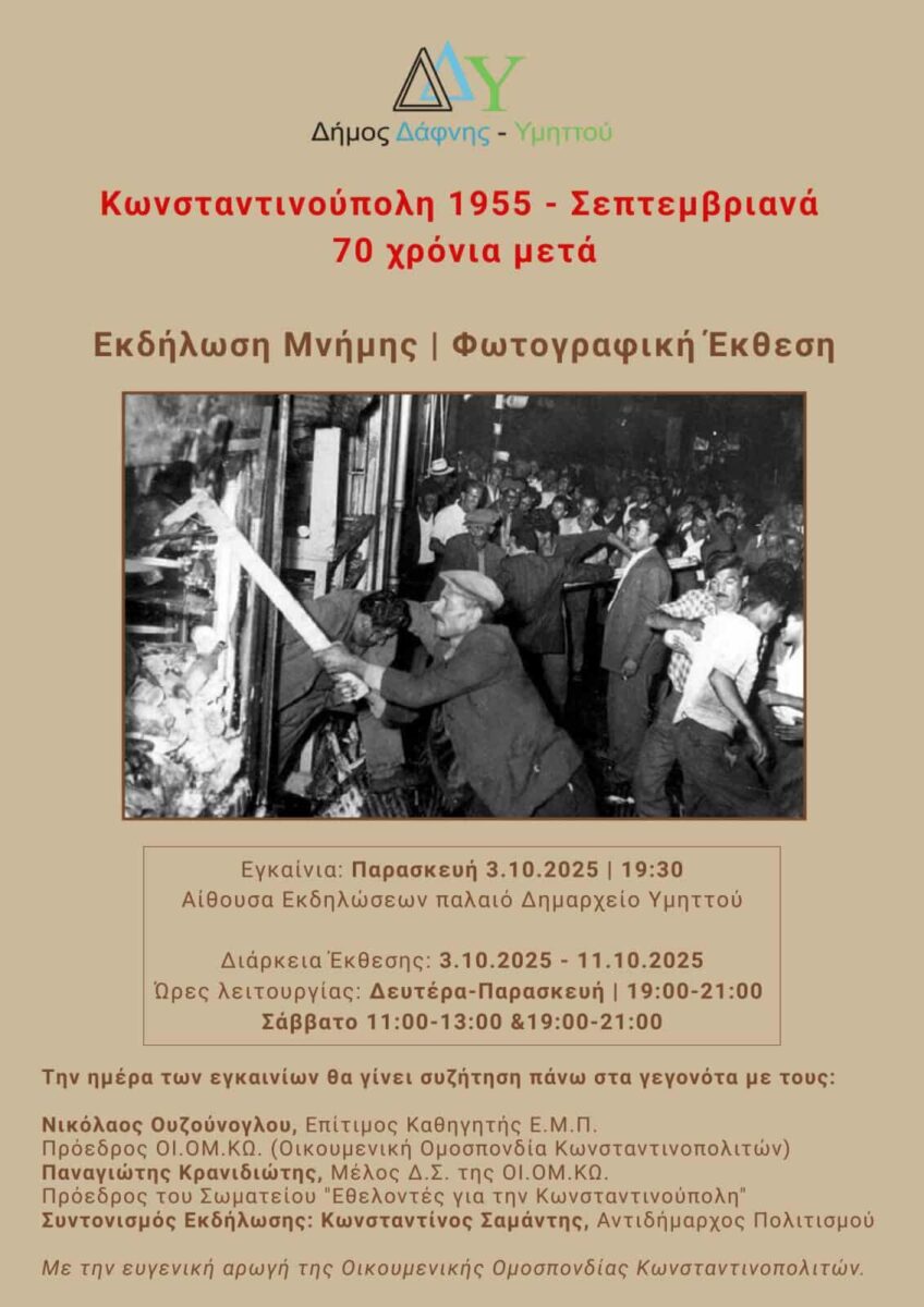 Αρχική » Εκδήλωση – εγκαίνια έκθεσης: “Κωνσταντινούπολη 1955 – Σεπτεμβριανά …70 χρόνια μετά” (Υμηττός – 3/10/25)