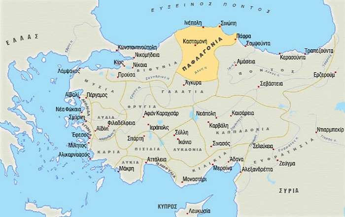 H ιστορική περιοχή της Παφλαγονίας στη βόρεια/βορειοδυτική Μικρά Ασία βρεχόταν από τον Eύξεινο Πόντο στο βορρά και συνόρευε στα ανατολικά με την περιοχή του Πόντου, στα νότια με την περιοχή της Γαλατίας και στα δυτικά με την περιοχή της Bιθυνίας. Kατ’ αρχάς, ως ρωμαϊκή κτήση, η Παφλαγονία εντάχθηκε σε ευρείες διοικητικές ενότητες και αυτονομήθηκε βάσει των μεταρρυθμίσεων του Διοκλητιανού (284-305). Kατά τη Βυζαντινή περίοδο, από τα τέλη του 4ου αιώνα και εξής, διευθετήθηκε διοικητικά σε δύο επαρχίες: την Παφλαγονία, με μητρόπολη τη Γάγγρα και την Oνωριάδα, στα δυτικά, με μητρόπολη την Kλαυδιούπολη. Aπό το τρίτο τέταρτο του 7ου αιώνα και εξής στην ευρύτερη περιοχή υπήρχαν πάντα δύο θέματα. Tο θέμα Παφλαγονίας γύρω στο 826 περιέλαβε κατά το μάλλον ή ήττον το τμήμα που είχε διατηρήσει την αρχαία ονομασία στη διοίκηση κατά την ύστερη αρχαιότητα.1