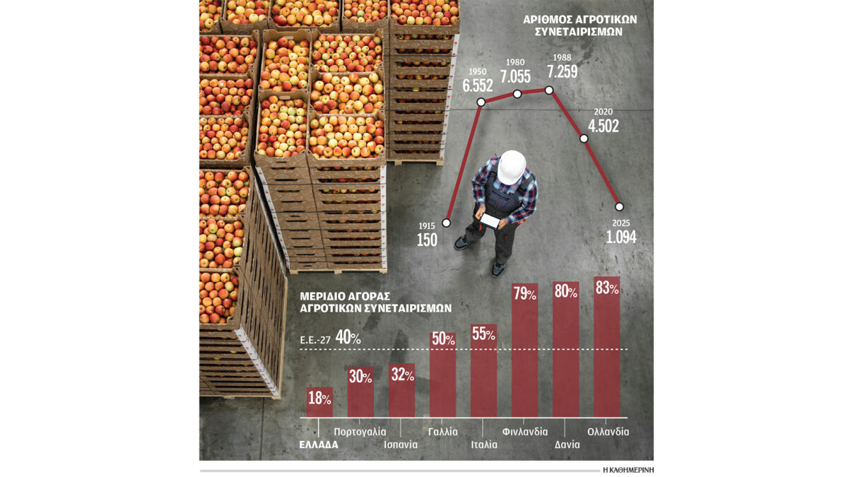 Ετσι, ενώ σε επίπεδο Ευρωπαϊκής Ενωσης το μερίδιο αγοράς των αγροτικών συνεταιρισμών φτάνει το 40%, στην Ελλάδα καταγράφεται μία από τις χαμηλότερες επιδόσεις, με το μερίδιο αγοράς των αγροτικών συνεταιρισμών να διαμορφώνεται σε περίπου 18%. Το υψηλότερο μερίδιο αγοράς αγροτικών συνεταιρισμών, 83%, καταγράφεται στην Ολλανδία, εκεί όπου δημιουργήθηκε η γνωστή μας FrieslandCampina με μέλη της 14.183 κτηνοτρόφους, τζίρο 12,92 δισ. ευρώ το 2024 και κέρδη 527 εκατ. ευρώ.