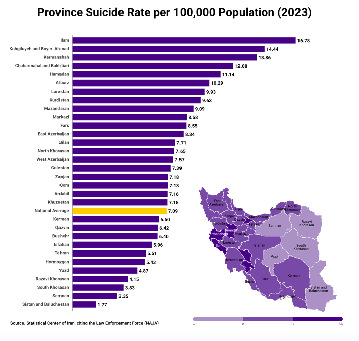 Επιπλέον, το ποσοστό αυτοκτονιών σε αυτές τις περιοχές έχει σχεδόν διπλασιαστεί από το 2011, με απότομη επιτάχυνση μετά το 2018, μετά την επανεισαγωγή των κυρώσεων. Επτά από τις οκτώ περιοχές με τα υψηλότερα ποσοστά αυτοκτονιών βρίσκονται στην περιοχή του Ζάγρου. Η απόγνωση είναι βαθιά και δεν είναι μόνο αποτέλεσμα της οικονομικής κατάρρευσης, αλλά και παραγόντων όπως η μετανάστευση σε μεγάλες πόλεις ή στο εξωτερικό, η οποία υπονομεύει την τοπική κοινωνική αλληλεγγύη, καθώς και η μειωμένη δυνατότητα για γάμο, η κατάχρηση ουσιών, τα ασφυκτικά διαγενεακά και πολιτισμικά εμπόδια και η περιθωριοποίηση των γυναικών.
