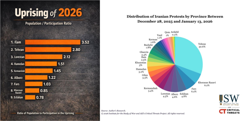 Είναι επίσης εντυπωσιακό το γεγονός ότι ο μεγαλύτερος αριθμός θανάτων έχει σημειωθεί στις μεγάλες κεντρικές πόλεις όπως η Τεχεράνη, το Μασχάντ, το Ισφαχάν, το Καράτζ και η βόρεια Ραστ, όπου η πλειοψηφία του πληθυσμού είναι Γκιλάκ (η τέταρτη πόλη σε αριθμό είναι το Κερμάνσαχ, όπου η πλειοψηφία του πληθυσμού είναι Κούρδοι). Ενώ οι βιομηχανικές και άτυπες εργατικές γειτονιές αυτών των πόλεων έχουν συμμετάσχει λιγότερο ορατά – εν μέρει επειδή οι μονάδες αστυνόμευσης βρίσκονται σε αυτές τις περιοχές και η καταστολή μπορεί γρήγορα να μετατραπεί σε χρήση πραγματικών πυρών ενάντιον των διαδηλωτών – οι περιφερειακές περιοχές που είναι ενεργές τώρα λειτουργούν παρόμοια με αυτές τις φτωχές αστικές περιοχές ως «δεξαμενέςτης εξέγερσης».