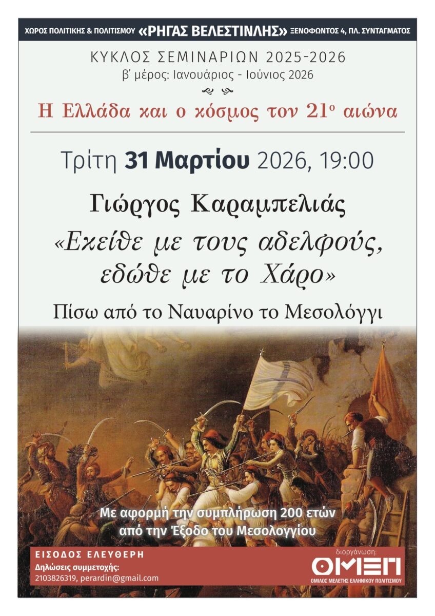 Περισσότερο το θέμα θα αναπτύξει ο Γιώργος Καραμπελιάς την Τρίτη 31 Μαρτίου 2026 στις 19.00 σε διάλεξή του με θέμα:
